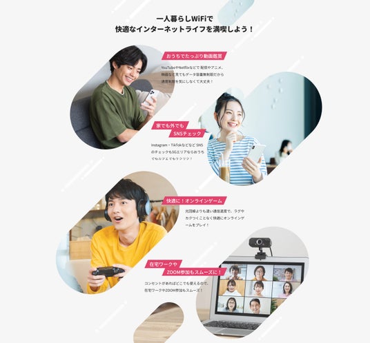「一人暮らしWiFi」は、一人暮らしの学生や単身赴任者、シンプルな生活を求める方に向けたサービスです。特に、一人暮らしを始めたばかりの学生や引っ越しの多い単身赴任者にとって、工事不要で手軽に使い始められる点は大きな魅力。