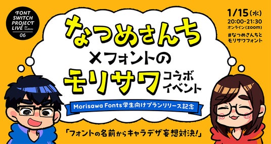 株式会社モリサワ(以下モリサワ)は、 Morisawa Fonts学生向けプランリリースを記念して、お絵描き夫婦クリエイター「なつめさんち」をお招きし、なつめさんち×フォントのモリサワ コラボイベント「フォントの名前からキャラデザ妄想対決!」を、2025年1月15日(水)にオンライン開催します。