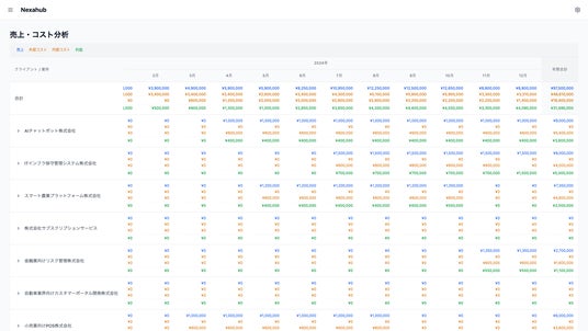 Nexahub(ネクサハブ)は、SES、ITコンサル、受託開発など、クライアントとの契約を基盤とするビジネスにおいて、面倒な月末・月初業務を劇的に簡略化する革新的なAIプラットフォームです。契約書をアップロードするだけで、AIが契約条件を自動的に抽出し、請求・支払いの予定データを生成します。これにより、従来スプレッドシート上で人力で行っていた煩雑な計算・確認作業を削減し、短時間で正確な数値を把握することが可能となります。