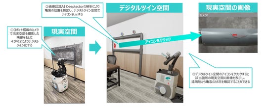 遠隔で操作する点検ロボット(HBA SMART ROBOT)のアームに取り付けたカメラで撮影した映像をもとに、画像認識AI Deeptector(R)による解析を行い、現実空間の壁面上のパイプの亀裂を検知してデジタルツイン環境に即時反映する検証を行いました。あわせて、デジタルツイン環境において、現実空間と同じ位置にプロットした亀裂を示すアイコンをクリックすると、現実空間の亀裂のある箇所の画像を参照可能とする仕組みを確認しました。今回の検証では4K 60fpsの高解像度映像を無線とAPNを通じて送信、遠隔地においても遅延を感じることなく亀裂の検知や解析が可能であり、設備点検への実用化可能な水準であることが確認できました。