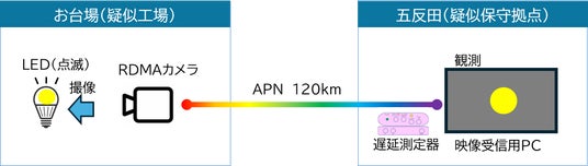 CPUを介さずにメモリーへの高速なデータ通信を可能にする Remote Direct Memory Access(RDMA)カメラを用いてAPN上での大容量な映像をライブで伝送する検証を行いました。カメラとPCをつなぐAPN間の距離を0km~120kmに変化させながら、映像を送信した結果、APN間の距離が長くなるにつれてスループット(データ転送速度)と1秒間に表示される画像の数であるfps(フレームレート) の低下がみられました。2Kと4Kの映像の実測値からシミュレーションを行い、APN距離とスループットの関係性を明らかにしました。また、映像の遅延に関して、APNの伝送遅延よりも機器の処理遅延の影響が大きく、機器選定の重要性がわかりました。さらに、今回のRDMAによる伝送は一般的なTCP伝送と比較して、CPU負荷が6%軽減され消費電力の抑制効果を確認しました。