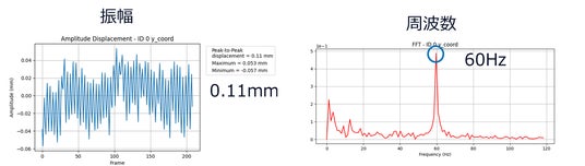ロボットのカメラが認識・撮影した、パイプの映像から振動の有無を解析しました。ロボットは、マーカーから解析対象のパイプを認識しており、パイプの認識違いはありませんでした。また、映像解析からパイプの振動振幅と周波数を取り出すこともできました。ロボット自体もモーターなどで振動している中ではありますが、問題なく映像からパイプの振動を解析でき、パイプが振動している時間を特定することができました。この結果を受けて、実用レベルの参考値として指定した振幅0.1mm、周波数60Hzを解析できるか、三菱ケミカル株式会社岡山事業所設備技術部と動作確認しています。