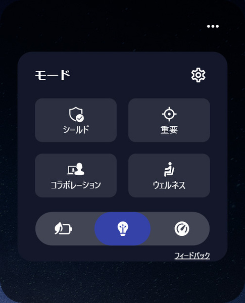 また、今回のAura Editionでは即応性も向上している。これまで少々わかりにくかった、深い階層にある設定の変更も、ボタン操作で立ち上がる「ダッシュボード」から簡単にできるように改善。さらに、F8キーのワンプッシュでいつでも起動できる「スマート・モード・ウィジェット」からは、「シールド」、「重要」、「コラボレーション」、「ウェルネス」などのモードを素早く切り替え可能だ。例えば「シールド」モードを有効化すると、あらかじめ設定したVPNに接続するといった動作をワンステップで行える。