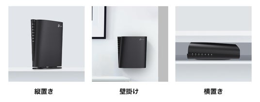 「Archer AX80V」は、省スペース設計で縦置きに対応し、限られたスペースでもすっきり設置可能です。壁掛けや横置きにも対応しており、設置場所に応じて自由にレイアウトを変更できます。スタイリッシュなデザインと柔軟な設置性で、どんな空間にもスマートにマッチします。