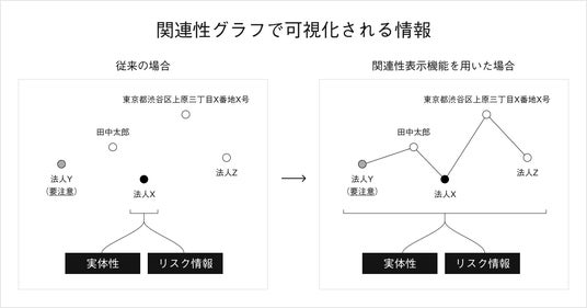 一見無関係な複数事業者が実は陰で協力し合い、詐欺や不正を行う例が後を絶ちません。こうした事例を防ぐためには、取引可否の判断の際、取引相手だけでなく関係事業者も含めたリスク・実体性の評価が重要です。しかし、どの事業者がどの事業者と関係を有しているかといった全容や、個々の関係性を把握する有効手段はこれまでありませんでした。こうした背景を受け、当社が収集した全国500万法人の最新の定性情報を基に、事業者同士のつながりを発見し、分析・解釈・整理が完了した状態で、ネットワークを迅速に参照できる「関連性表示機能」を開発しました。