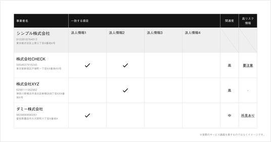 当社は、行政機関やインターネット上に点在する全国500万法人の定性情報を集約しデータベースを構築しています。このデータベースを基盤とした「SimpleCheck」は、通常収集・整理に数日を要する法人の最新の定性情報を約30秒でレポーティングするものです。金融犯罪防止や業務生産性向上を目的に、多くの金融機関やカード会社などで採用されています。