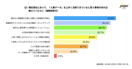 Q5で「人事データを利活用できている」と答えた企業を対象に、「人事データを上手く活用できていると思う事例」について質問したところ、その最多意見は「適切な人事戦略の立案に必要な人事情報の可視化(43%)」でした。次いで、「退職懸念やメンタルヘルスの定点観測・キャッチアップ(39.1%)」、「適切な人事戦略の立案に必要な人事情報の可視化(36.7%)」という結果になりました。