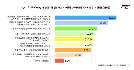 人事データを管理・蓄積する上で感じる課題の最多意見は「従業員情報に変更があった際に、利用する人事系システムへ人事データの登録が即座にできていないこと」