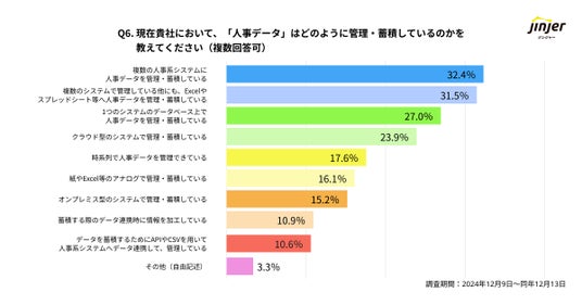 人事データの管理・蓄積方法として最も多くあった意見は「複数の人事系システムへ人事データを管理・蓄積している(32.4%)」でした。次いで「複数のシステムで管理している他にも、Excelやスプレッドシート等へ人事データを管理・蓄積している(31.5%)」、「1つのシステムのデータベース上で人事データを管理・蓄積している(27%)」、「クラウド型のシステムで管理・蓄積している(23.9%)」という結果になりました。