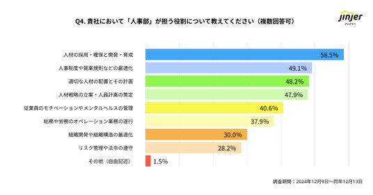 企業の人事部が担う役割として最も多かったのは「人材の採用/確保、人材開発/育成(58.5%)」でした。次いで、「人事制度や就業規則などの最適化(49.1%)」、「適切な人材配置とその計画(48.2%)」、「人材戦略の立案・人員計画の策定(47.9%)」という結果になりました。