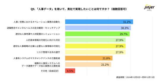 人事データを用いて、実現したいことで最も多くあった意見は「人事 / 労務におけるオペレーション業務の自動化(31.2%)」でした。次いで、「退職懸念やメンタルヘルスの定点観測・キャッチアップ(30.3%)」、「適切な人事考課や人材配置のシミュレーション(29.7%)」という結果になりました。