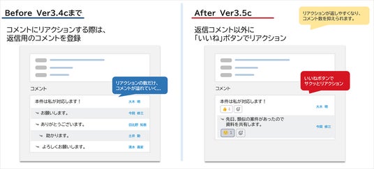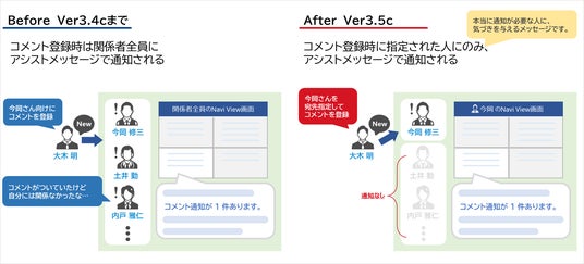 Ver3.4cまでは、コメントが登録されると関係者全員に通知が届いていましたが、Ver3.5cでは、コメントの宛先を指定できるようになりました。これにより、指定されたユーザーにのみ通知が届き、重要なコメントの見逃しを防止します。また、指定されないユーザーへの不要な通知を省き、効率化します。