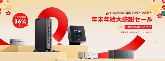 ミニパソコンを専門とするグローバルメーカーMinisforumが2024年12月23日(月)~2025年1月6日(月)まで、今年最後のビッグセール「年末年始大感謝セール」を開催します。日頃の感謝をこめて、今年発売開始した人気製品を最大36%OFFのお得な価格でご提供します。また、10万円以上お買い上げのお客様に特定ギフトボックスをプレゼントします。ぜひこの機会をお見逃しなく。