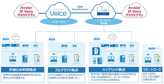 「TCloud for Voice」「CT-e1/SaaS」の外線に収容することで、フルクラウド構成/外線GW利用/既存PBXとのハイブリッド構成/リモートワーク対応など、多様なシステム構成が実現可能となります。