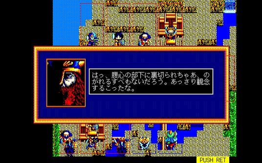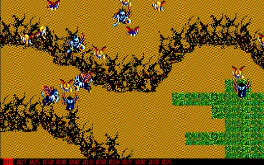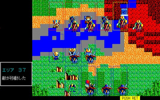 なおPC-9801版ではPC-8801版とは異なり、新たに騎兵やサーペントといった中型キャラクターの登場や、マジシャンの種類が追加されています。さらに同じマップ内で2部隊を切り替えて操作する新機能が追加されたことで、挟撃をはじめとする多彩な戦術が可能になりました。これにより、より洗練された戦術が楽しめます。またメニュー周りなども日本語表示となり、より遊びやすくなっています。