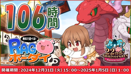 2024年12月31日(火)15:00から年越しを経る106時間、プレイ利用権がなくても『ラグナロクオンライン』が遊べるRAGホーダイを開催いたします!