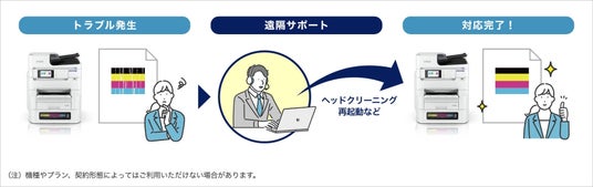 新商品から遠隔サポートに対応。サービスマンが訪問することなくヘッドクリーニングや再起動などの一部の操作を遠隔で操作できるので、万一のトラブル時でもお客様のダウンタイムを削減します。本機能については、エプソンのスマートチャージ対応モデル<LM>シリーズ、<PX>シリーズで対応を開始します。(2024年12月現在)