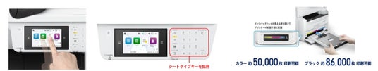 一目でわかる新UIを搭載した操作パネル、汚れにくいシートタイプキーを採用した操作ボタン、インクの場所が見えるインク窓の採用など、ストレスなく快適に操作できるよう使い勝手を向上しました。特にインクパックはインク窓から一目で場所がわかるため、誰でも簡単に消耗品交換が可能です。また、ブラックでは約86,000枚(注7)印刷可能な大容量インクパックを搭載し、より一層のダウンタイム削減に貢献します。