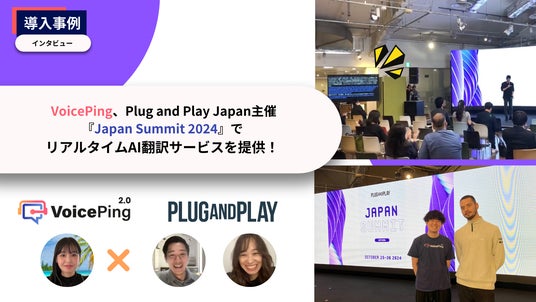 VoicePingは、Plug and Play Japan主催の「Japan Summit 2024」においてリアルタイムAI翻訳サービスを提供し、多国籍イベントにおける多言語対応の新たな可能性を示しました。「Japan Summit 2024」は、過去最大規模となる2,000名以上の参加者を迎え、スタートアップと大企業の連携を促進する場として開催されました。本記事では、日頃からVoicePingをご利用いただいているPlug and Play Japanの伊東さんと塩盛さんに、イベントの背景やVoicePingの活用事例についてお話を伺いました!