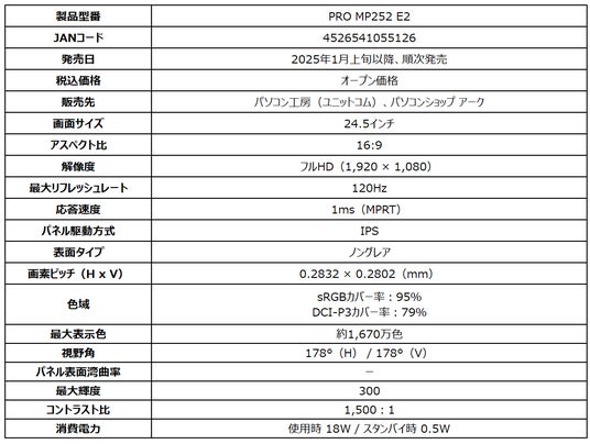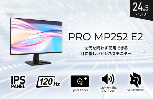 世代を問わずに使用できる目に優しいビジネス向けモニター 24.5インチ・フルHD・IPS・スクロール時も見やすいリフレッシュレート120Hz ユニットコム専売モデル「PRO MP252 E2」発売