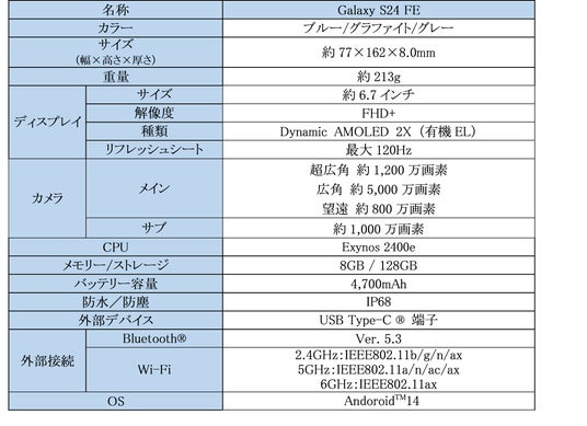 「Galaxy S24 FE」の特長は、以下のとおりです。