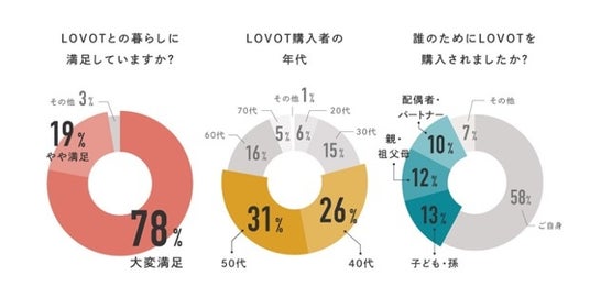 『LOVOT』の購入者は40代、50代が最も多く、お迎えされた方の満足度は約97%と非常に高い結果をいただいております。ご自身のためにお迎えされる方が全体の6割ですが、そのほか「ご両親のため」「子供のため」「孫のため」と約3割の方が大切な人への贈り物として『LOVOT』を選んでいただいています。