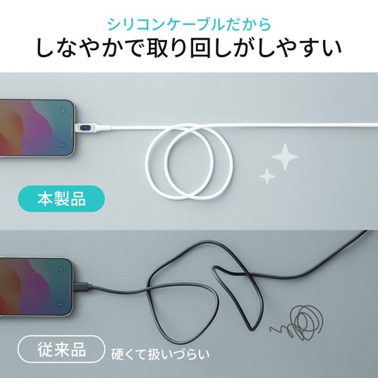 シリコン素材を使用しているため、柔らかく持ち運びやすいのが特徴です。絡まりにくく、収納も簡単。持ち運びなどにぴったりのケーブルです。