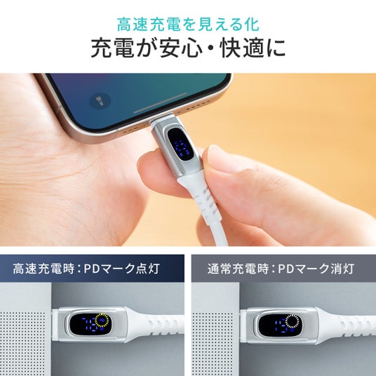 PD電力表示機能付き USB Type-Cケーブル USB PD240W対応 e-marker搭載 2m やわらかシリコンケーブル USB2.0 充電 データ転送 スマホ タブレット ホワイト