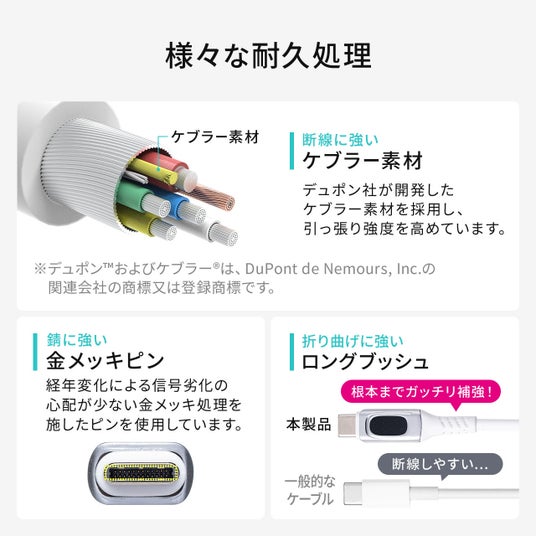 ケブラー繊維を採用し、引っ張りやねじれによる断線を防ぎます。さらに、金メッキ処理されたピンが信号劣化を抑え、長期間安心してご使用いただけます。