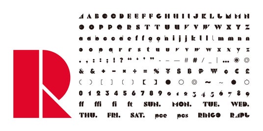 既存のRINGOロゴタイプの特長である太さ、幾何学的な形状、そして極細のスリットや線が書体デザインのベースとなっています。
