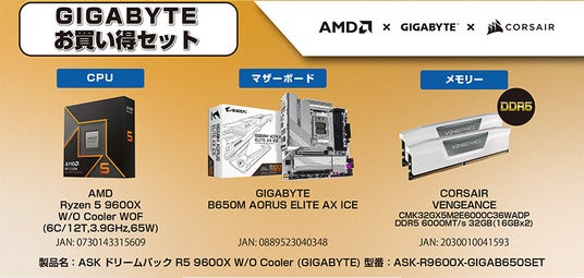 製品名: ASKドリームパック R5 9600X W/O Cooler GIGABYTE