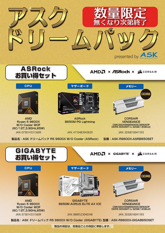 「ASKドリームパック」は、弊社にて厳選した自作PCパーツをワンパックにした、非常にお買い得なセットです。AMD社製プロセッサ「AMD Ryzen 5 9600X」とCORSAIR社製メモリ「VENGEANCE DDR5-6000 32GB White」は全種共通しており、「ASKドリームパック ASRock」にはASRock社製マザーボード「B650M PG Lightning」、「ASKドリームパック GIGABYTE」にはGIGABYTE社製マザーボード「B650M AORUS ELITE AX ICE」をセットにしました。