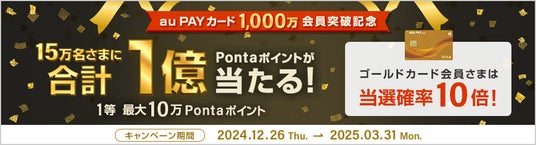 auフィナンシャルサービス、KDDI、沖縄セルラーが提供する「au PAY カード」の有効会員数が2024年12月に1,000万人を突破した(注1)ことを記念し、2024年12月26日から2025年3月31日までの期間中、抽選で合計1億Pontaポイントをプレゼントするキャンペーンを開催します。
