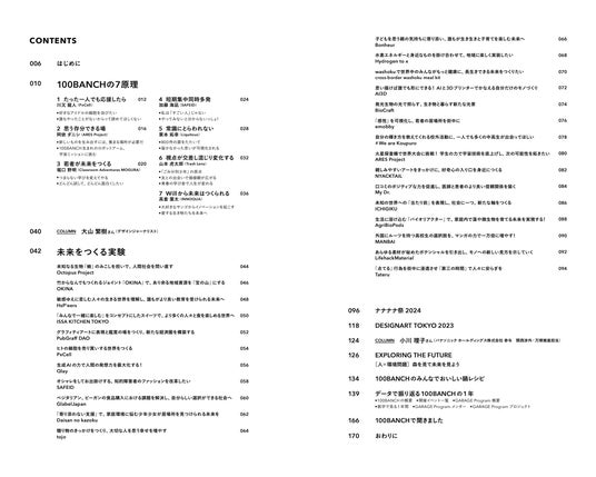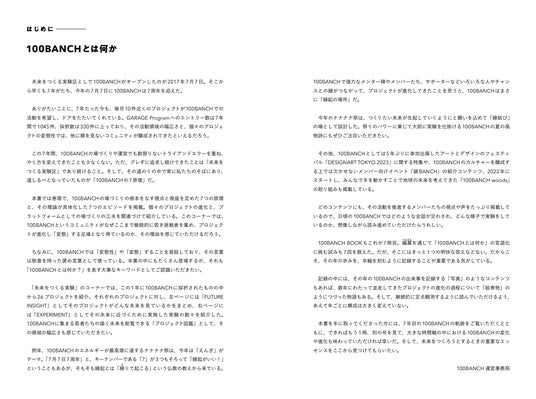 本書は、7年目にあたる2023年7月~2024年7月までの100BANCHの活動を収録。100BANCHの運営に欠かせない場の根本と視座を定めた7つの原理とそれが実体化したエピソードをはじめ、100年先に向かって日々、実験に取り組むGARAGE Programの採択プロジェクトの中から26プロジェクトを紹介しています。