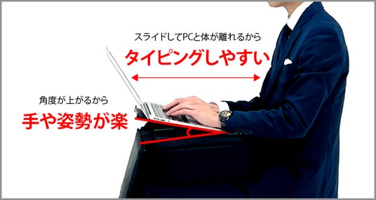 - まるで膝上デスク。国内特許取得(特許7448173、国際特許出願番号:PCT/JP2023/040301)のスライド式PCスタンドが、いつもの楽な姿勢のタイピングを実現しました。