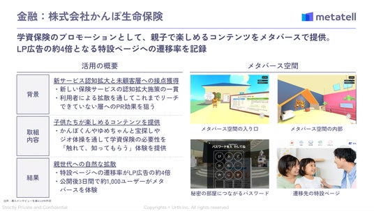 各事例を、「活用の概要(活用の背景、取り組み内容、結果)」、「メタバース空間の画像」という構成で紹介しています。