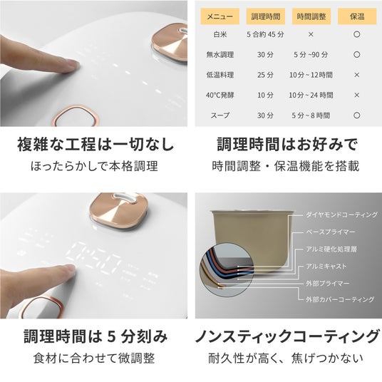 「ていとうシェフ」は低温料理や無水調理、40℃発酵など、12の調理モードを搭載し、食材を入れたらボタンを押すだけ。誰でもシェフのように仕上がるため、料理好きはもちろん、料理が苦手という方も使いこなせるマルチクッカーです。