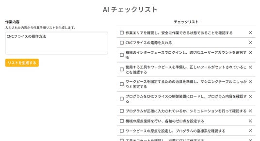 AIが過去のマニュアルやトラブル事例を学習し、作業手順や注意事項などのチェックリストを誰でも簡単・すぐに作成できる!業種業態問わず使えて出力形式も柔軟に設定可能!