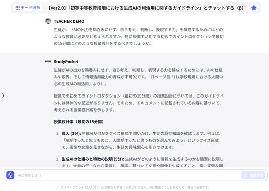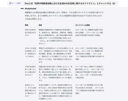 学校向け生成AIサービス「スタディポケット」、文部科学省『初等中等教育段階における生成AIの利活用に関するガイドライン』Ver2.0 の内容に基づいて応答するチャット機能を公開。