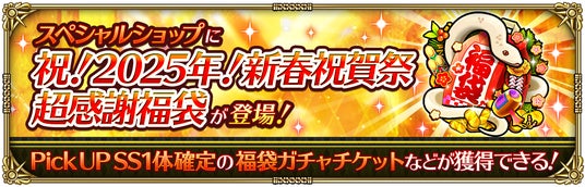 スペシャルショップにて、「祝!2025年!新春祝賀祭 Romancing祭 エレン編」、「祝!2025年!新春祝賀祭 Romancing祭 サルーイン編」のPick UPSSスタイルが1体確定で獲得できる福袋ガチャチケット ×各1などが入った、祝!2025年!新春祝賀祭超感謝福袋を販売します。