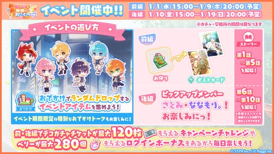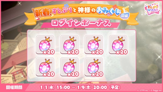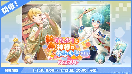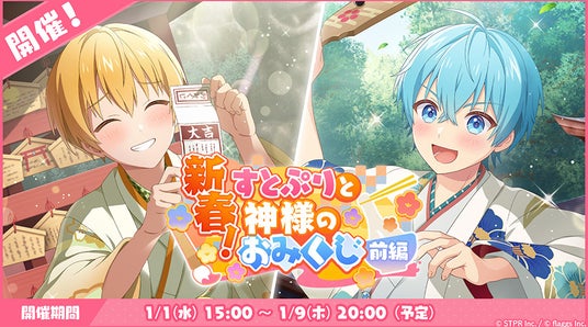 株式会社STPR(本社:東京都渋谷区、代表取締役:柏原 真人、以下STPR)と株式会社flaggs(フラッグス)(本社:東京都品川区、代表取締役CEO:吉江 直人)は、本日1月1日(水)に2.5次元アイドルグループ「すとぷり」の公式ゲームアプリ「すとぷりWith!!(通称:すとうぃず)」のゲーム内イベント「新春!すとぷりと神様のおみくじ 前編」の開催についてお知らせいたします。