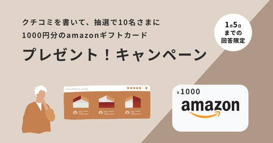 1月5日までにクチコミを投稿してくださった方の中で、抽選で10名に、1000円分のamazonギフトカードお送りします。ぜひこの機会にあなたの経験を教えてください。
