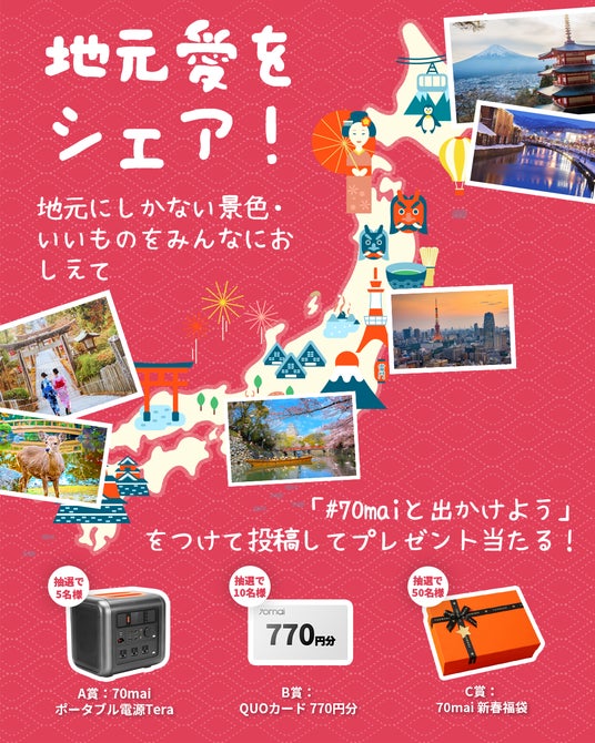 地元の魅力をシェアして、全国の仲間とつながりましょう。新しい年も、70maiと共に旅をもっと楽しく!