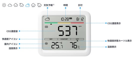 SwitchBot温湿度計シリーズの最新作!厚生労働省の推奨するNDIR方式を採用したCO2センサーです。CO2濃度とともに温湿度やお天気アイコン(ハブ製品が必要)、日時など欲しい情報がひとつのディスプレイに。また、「換気アラーム」機能付きで、事前に指定したCO2の濃度基準、温湿度の範囲を超えるとお知らせしてくれます。さらに、ハブ製品や加湿器、サーキュレーターなどと連動することで、一切ノータッチで快適な温湿度&キレイな空気の維持を実現できるのもポイントです。空気の質や天候を「視える化」で、健康的な毎日に。