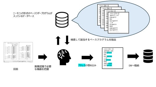 図面情報を画像認識AIで読み取り、そのデータを基にラダープログラミングを自動作成します。ラダープログラムの基礎部分は、予め設定されたデータベースから該当する要素を抽出して生成します。