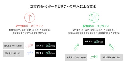 双方向番号ポータビリティは、現在利用中の固定電話番号を変更することなく他の通信サービスへ移行できる仕組みです。これまで固定電話番号の移行はNTT東日本・NTT西日本の加入電話、及びISDNの番号と他社間での移行(片方向)しか対応できなかった中、双方向番号ポータビリティに対応した事業者間では、これまでの加入電話、ISDNのほか、ひかり電話や直収電話・IP電話など番号の種類に関係なく、双方向での固定電話番号の移行が可能になります。この新たな仕組みにより、ユーザーは固定電話番号を維持したまま、より自由に通信サービスを選択・乗り換えできるようになるため、サービス間の競争を促し、より良いサービスの提供や顧客満足度向上につながることが期待されます。