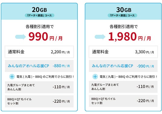 ※「みんなのアオハル応援キャンペーン」「九電まとめて割」「BBIQ×QTモバイルセット割」適用時
