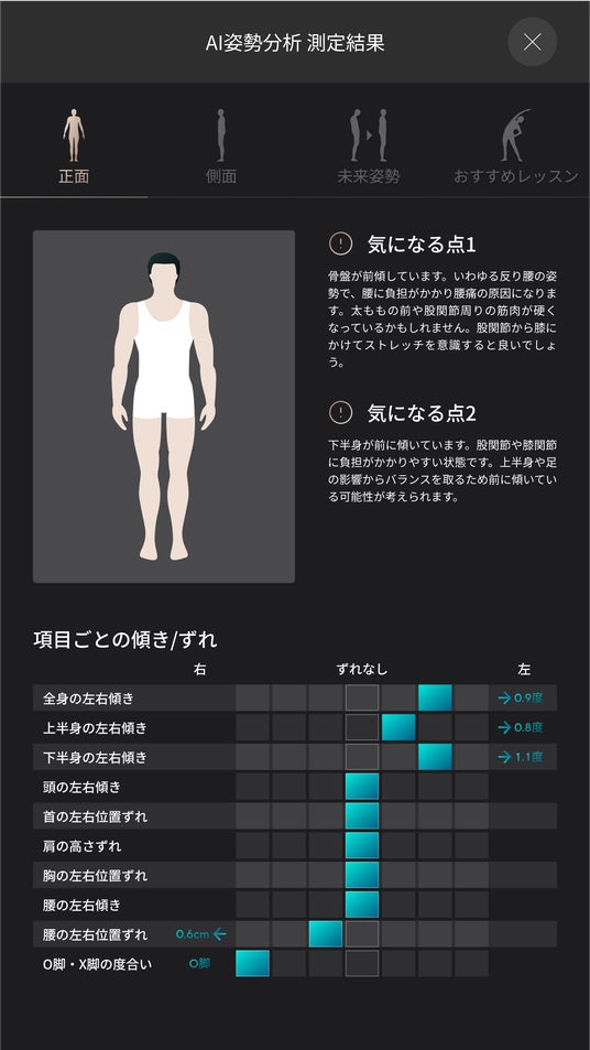 【MIRROR FIT. 】内に導入された【AI姿勢分析】で計測すると、測定結果がその場ですぐ確認する事が出来ます。
