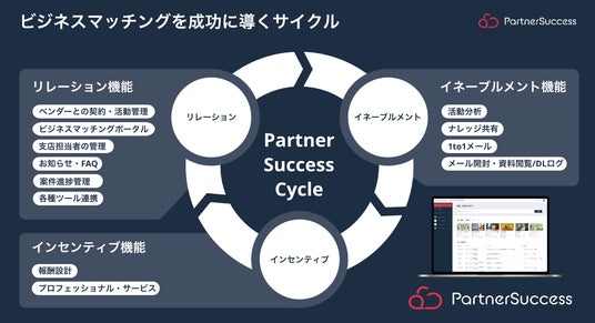 「PartnerSuccess PRM」は、ベンダー・本部・支店間の情報共有等のコミュニケーションを一元管理することで、包括的にデータを可視化し有効なビジネスマッチング支援を行うことができる次世代型・ビジネスマッチング連携管理クラウドです。