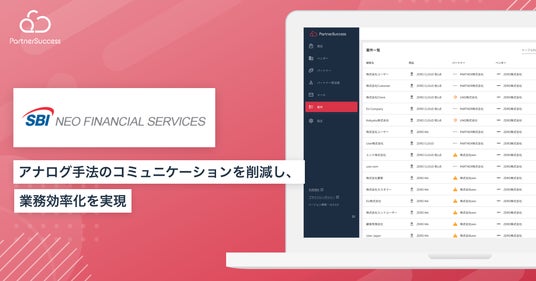 次世代型 ビジネスマッチング連携管理クラウド PartnerSuccess PRM(※1)を開発運営するパートナーサクセス株式会社(本社:東京都港区、代表取締役 永田雅裕、以下「パートナーサクセス」)はSBIネオファイナンシャルサービシーズ株式会社(本社:東京都港区、代表取締役 吉木 直道、以下「SBIネオファイナンシャルサービシーズ」)に「PartnerSuccess PRM for BANK」を導入いただきました。